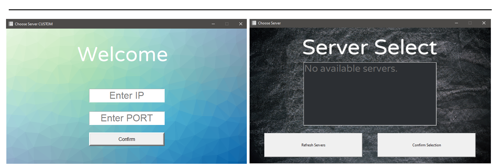 To connect to an unsupported server, press Custom Entry. Please keep in mind that any server not supported by the API is most likely not compatible with the client provided.